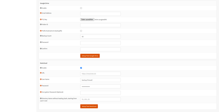- Automatisierte Backups können auf unterschiedliche Ziele erstellt werden. Dazu zählen ownCloud, Nextcloud oder Google-Drive. Dazu müssen lediglich die Zugangsdaten für den entsprechenden Endpunkt hinterlegt werden und die Firewall erstellt automatisch Backups.