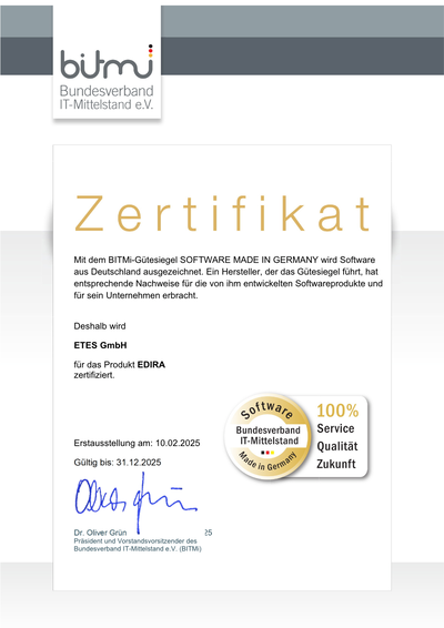 Daher können wir mit Freude verkünden, dass unsere eigens entwickelten Produkte EDIRA und ETES Meldestelle mit dem Gütesiegel „Software Made in Germany“ ausgezeichnet wurden und den damit verbundenen Kriterien unterliegen.
