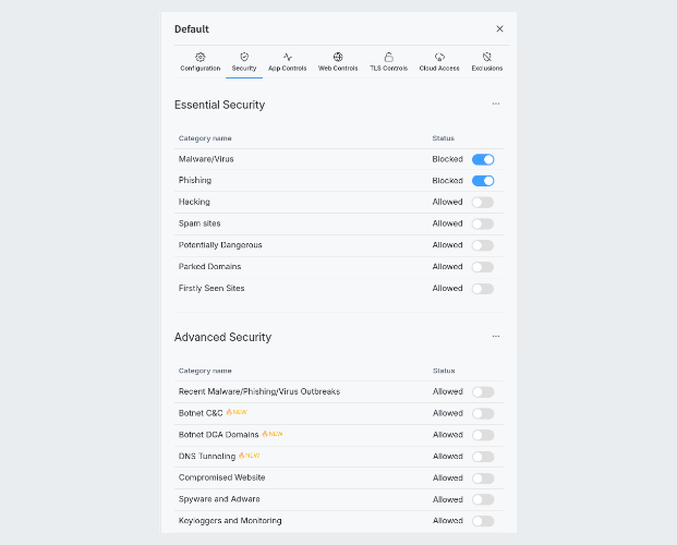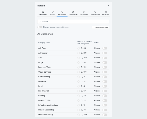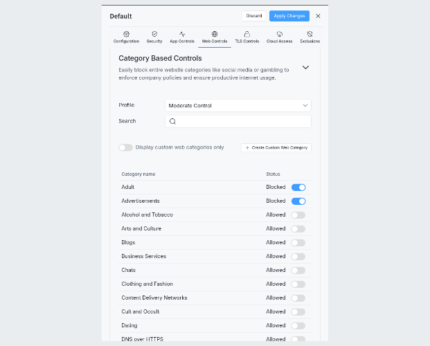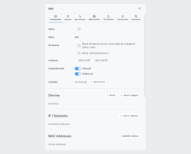 Eine Firewall ohne Regeln ist nutzlos. Daher können unter Policies entsprechende Zugriffsregeln definiert werden. Hier stehen umfangreiche Funktionen zur Verfügung. Es können mehrere Policies erstellt werden, welche dann für unterschiedliche Geräte greifen. Regeln können zum einen über bereitgestellte Kategorien und Applikationen erstellt werden, zum anderen können individuelle URLs, Applicationen etc. blockiert bzw. erlaubt werden. Auch kann die Regel auf IP-Bereche, Netzwerk-Interfaces oder sogar MAC-Adressen eingeschränkt werden.