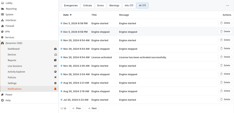 Im Menüpunkt Notifications werden alle Systemmeldungen von Zenarmor zusammengefasst dargestellt: