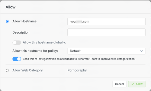 Im Screenshot sind in diesem Fall alle blockierten Verbindungsversuche aufgelistet. Wenn es sich beispielsweise um einen False-Positive-Block handelt, kann die Webseite direkt über das Kontext-Menü freigegeben werden. Hierbei kann bei der Erstellung der Regel direkt unterschieden werden, ob diese URL global oder nur für eine entsprechende Policy erlaubt werden soll: