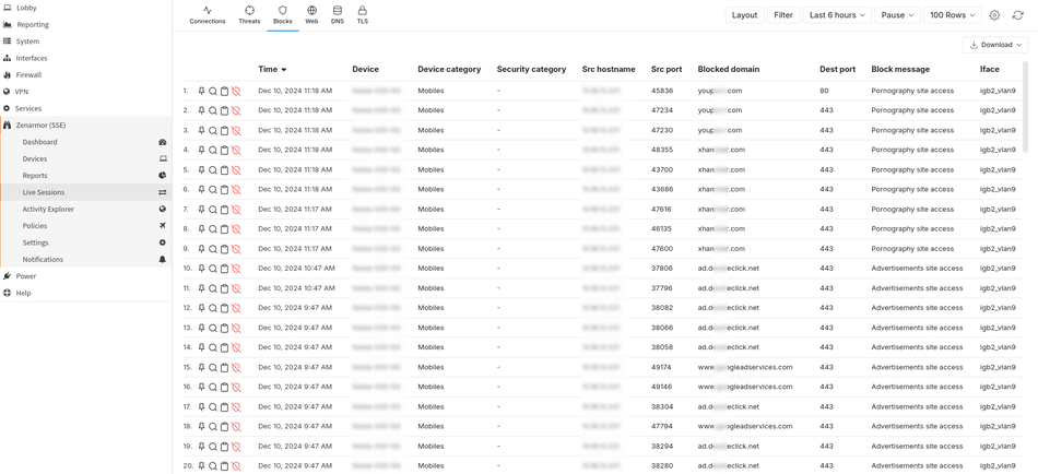 Neben den Reports, welche den Status in der Vergangenheit widerspiegeln ist es elementar wichtig, auch den aktuellen Traffic einzusehen und ggf. direkt reagieren zu können. Dies kann im Menü-Punkt „Live Sessions“ erfolgen, unter dem der Live-Traffic aufgelistet wird. Hier selektieren wir uns den Punkt „Blocks“ heraus, welcher alle blockierten Verbindungen darstellt.