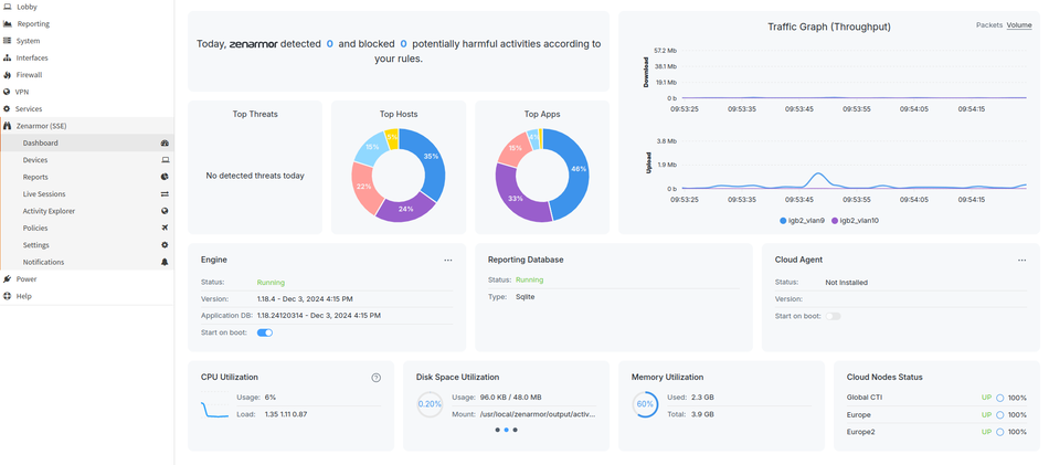 Zenarmor integriert sich nahtlos in OPNsense. Dadurch sind alle Funktionen hierfür über das Webinterface der OPNsense-Firewall erreichbar. Auf dem Dashboard werden einige Basis-Informationen dargestellt. Hierbei sind z.B. die aktuellen Durchsatz-Informationen der Interfaces, Top-Talker-Informationen sowie einige System-Informationen enthalten.