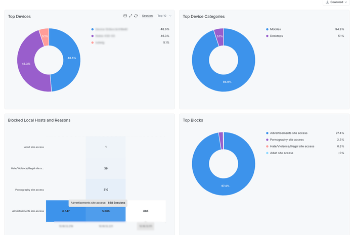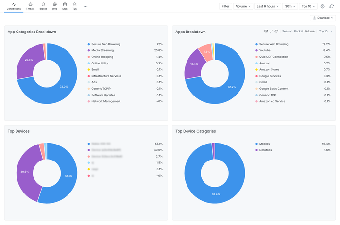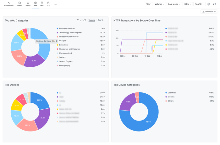In Zenarmor steht bereits eine Vielzahl von vordefinierten Reports und Views zur Verfügung. Neben den vordefinierten Reports und Views können weitere eigene Views mit unterschiedlichen Metriken erstellt werden.