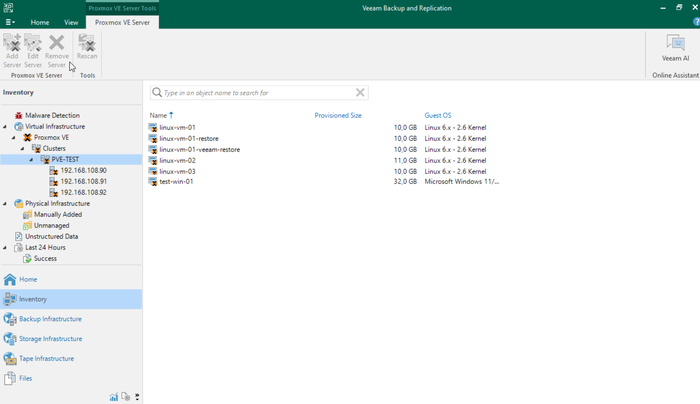 Selbstverständlich haben wir die Proxmox VE-Unterstützung direkt konfiguriert und umfangreich in unserem Test-Setup getestet. Die Integration erfolgt sehr einfach, birgt jedoch den einen oder anderen Fallstrick, den es zu berücksichtigen gilt. Backups von virtuellen Maschinen können sehr leicht erstellt werden. Auch eine Wiederherstellung erfolgt intuitiv und ohne Hürden.